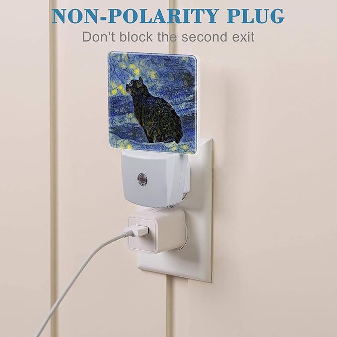 - [Energy Saving]: Made with high-quality plastic, this Starry sky black cat painting nightlight has a long lifespan of over 20000 working hours without bulb replacement, and it consumes less than 50 cents annually for power consumption. Its well-designed mini outlook is space-saving and doesn't block the bottom outlet for other devices.