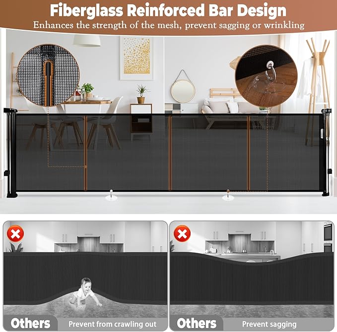 - 【Fiberglass Reinforced Mesh Rods】Upgraded retractable baby gate for stairs have added 3 additional reinforced rods in the mesh, enhancing its strength to prevent sagging, wrinkling, the bottom is less likely to lift, which prevents children and pets from going under the mesh, unfolds and retracts smoother and doesn't get stuck.