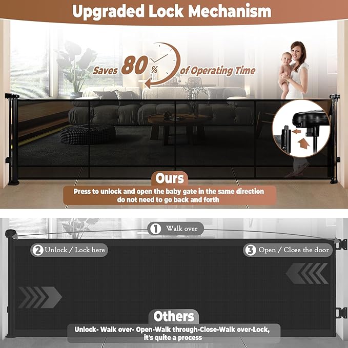 - 【Upgraded Dual Locking Mechanism, Saves 80% of Operating Time】Retractable baby gate not only has a mesh lock to control the retractable function, and on the other side adopts "Push+Press" gate lock to operate open/close the door independently, unlock and open the baby gate in the same direction, do not need to go back and forth, save 80% of the operating time.