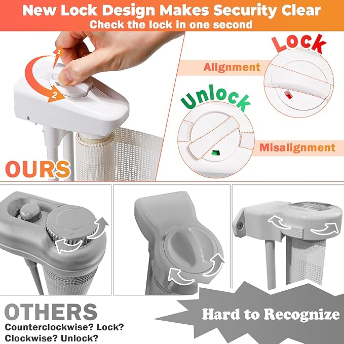 - 【Convenient Lock Design for Busy Moms】 This retractable mesh gate features a separate design for the mesh lock and door lock, allowing you to easily open and close the gate right at the entrance without having to unlock the mesh lock first. Other retractable baby gates require you to unlock the mesh before opening the door and then relock it after closing the door. Our baby gate saves valuable time for busy moms! Plus, the mesh lock has a geometric misalignment design, making it easy to see at a glance whether it's locked. These thoughtful features are perfect for moms on the go!