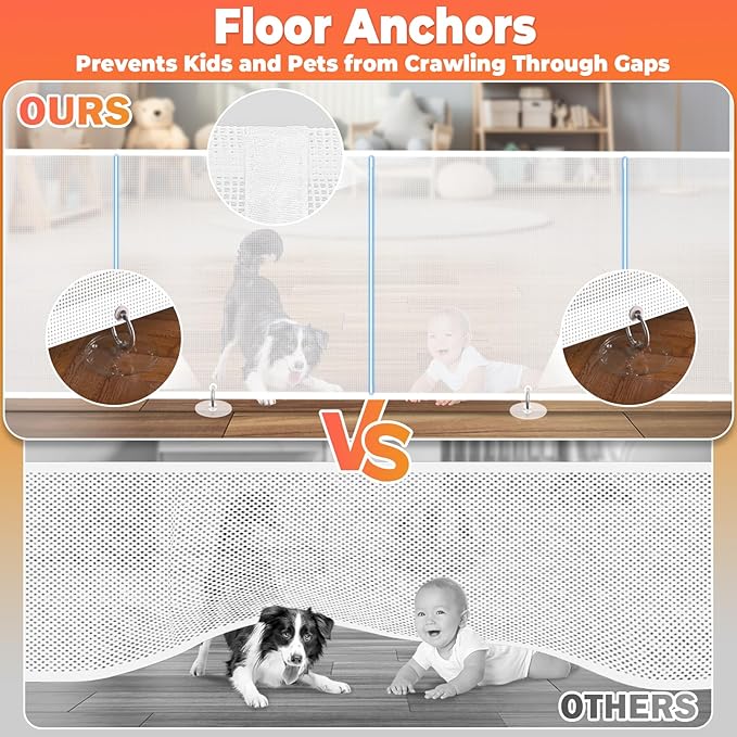- 【Durable Scratch-Resistant Mesh】 The mesh of our retractable pet gate is made from high-strength polyester and PVC, significantly enhancing its durability. It can withstand scratching from sharp claws of cats and dogs without tearing. Additionally, it offers translucent, breathability, waterproofing, and flame resistance.