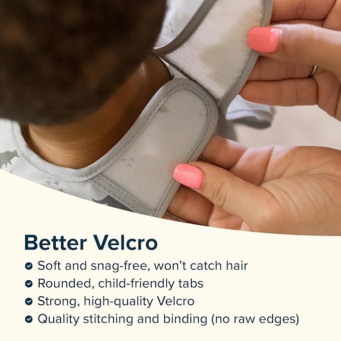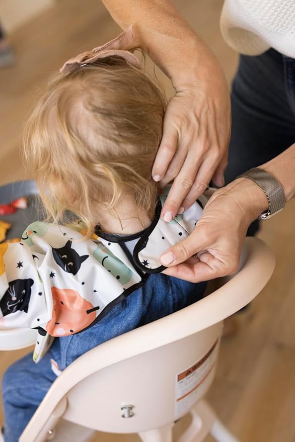 - EASY TO USE: Designed for baby-led weaning chaos, our waterproof baby bibs (6-24 months) feature a no-scratch closure that stays put during tugging but is also easy to remove. The 100% recycled polyester fabric wipes clean in seconds. New parents obsessed with baby feeding essentials love how these toddler-proof baby bibs transform messy high chair meals into stress-free bonding time. Perfect for baby bibs or toddler bibs.