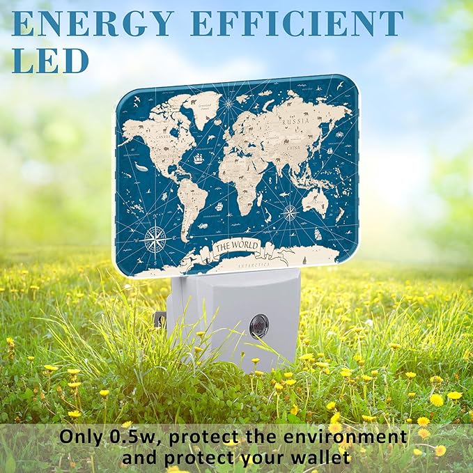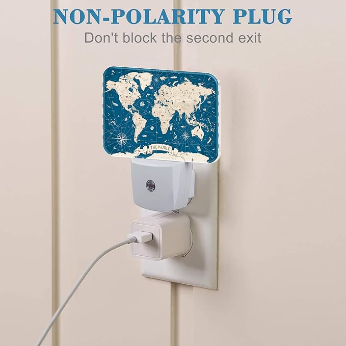 - [Energy saving saving]: Made with high-quality plastic, this Vintage Blue World Map nightlight has a long lifespan of over 20000 working hours without bulb replacement, and it consumes less than 50 cents annually for power consumption. Its well-designed mini outlook is space-saving and doesn't block the bottom outlet for other devices.