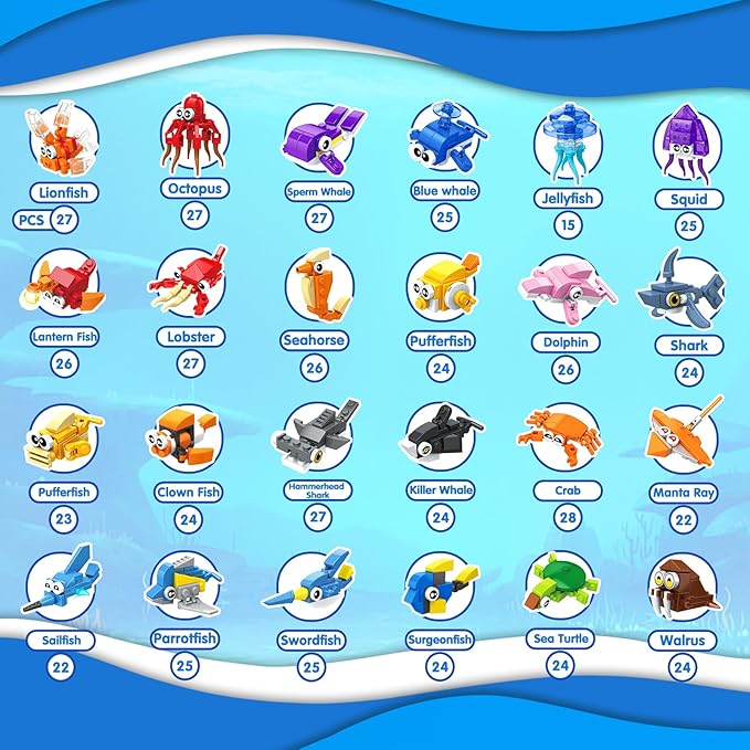 - 【24 Ocean Animals in Separate Bags】Includes 24 mini sea animals in individual bags with clear instructions. Great as building blocks set and kids party favors to keep little ones entertained for hours.