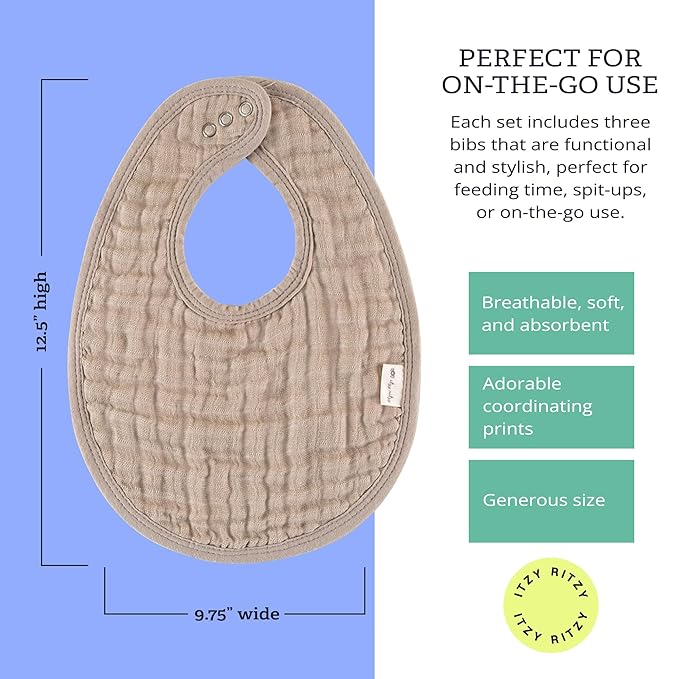 - SOFT & ABSORBENT: Say goodbye to messy mealtimes with our Itzy Ritzy baby bibs! Crafted from 100% cotton muslin, these triple-layer muslin bibs are ultra-soft, super absorbent, and designed to catch every droplet. Your little one will stay comfortable and dry, making feeding time a breeze!