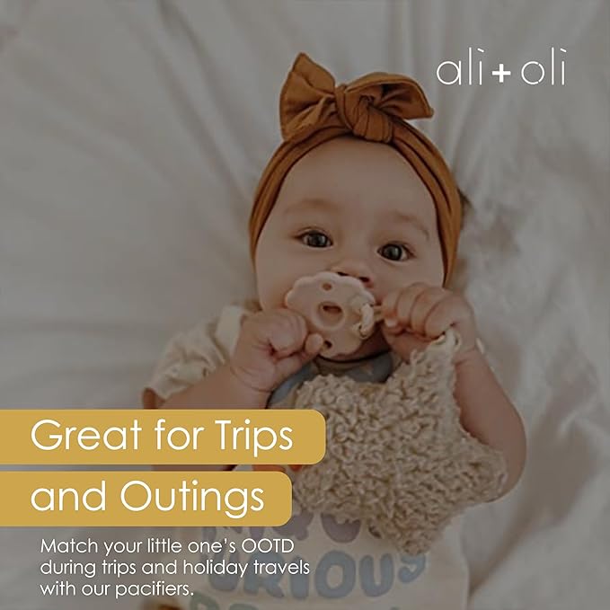 - COMES WITH 2 PACIFIERS: This Ali+Oli Pacifier Set of two quality silicone pacifiers is made for your infant ages 0 months and up. With two pacifiers in distinct colors in one pack, parents may let their babies use one and then keep the other or take it during trips and holidays. You may choose a rounded or a scallop edged pacifier in colors that suit your taste or match baby's outfit of the day.
