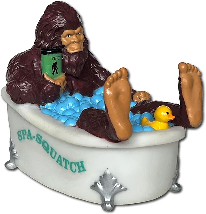 - SPA-SQUATCH - A must have for any bigfoot lover! This bigfoot is holding his cup while bathing his huge dogs, getting ready for his BIG pedicure! This sasquatch is the finest Big Foot décor for the bath and pool on the market... nothing like it! Perfect for the desk, bathtub, pool or even on your 4x4's dash!