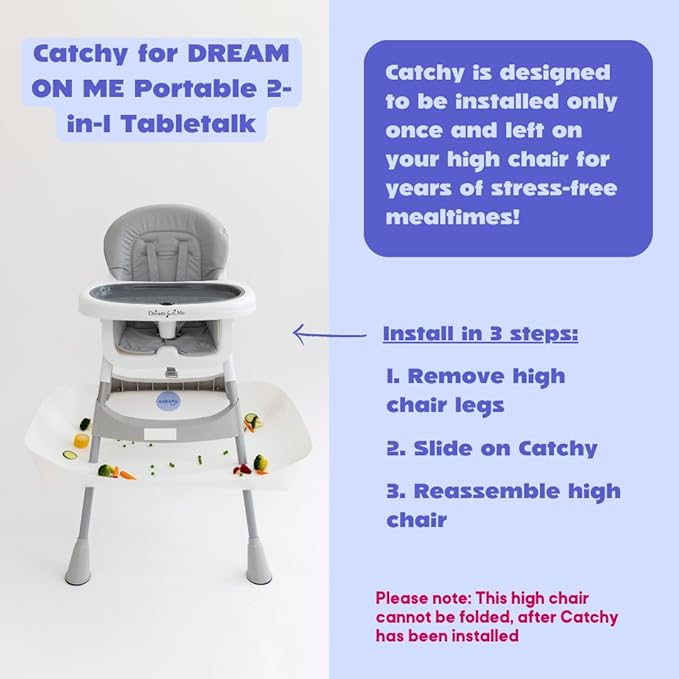 - DESIGNED TO BE INSTALLED ONLY ONCE. Unlike splat mats, our one time installation is left on your high chair for years of stress-free mealtimes! Please note that once the Catchy has been installed, the high chair can no longer fold.