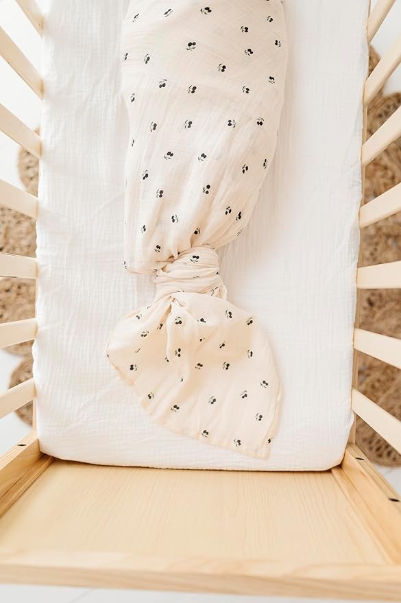 - This single pack muslin swaddle comes in a soft shade of ivory with a whimsical blue cherry print that complements baby’s nursery décor. This stylish swaddle blanket bundled in our gift-ready packaging makes it a perfect baby shower present for the baby in your life.