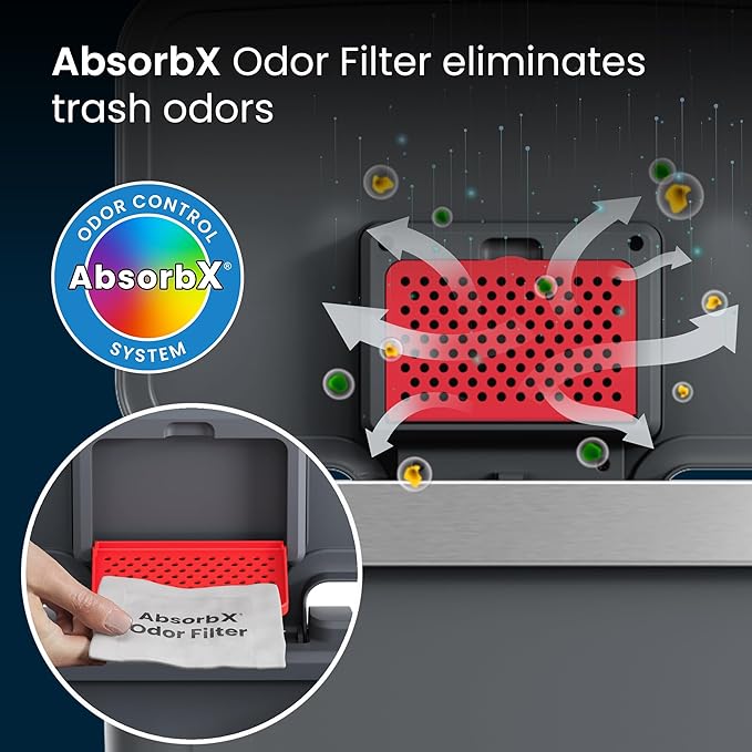 - STOP TRASH CAN KITCHEN ODORS – 1 AbsorbX Odor Filter is included to absorb and neutralize trash odors, for a fresh and clean smelling home with this 13 gallon trash can with lid. Tight lid seal of this recycling bin prevents odor leak.