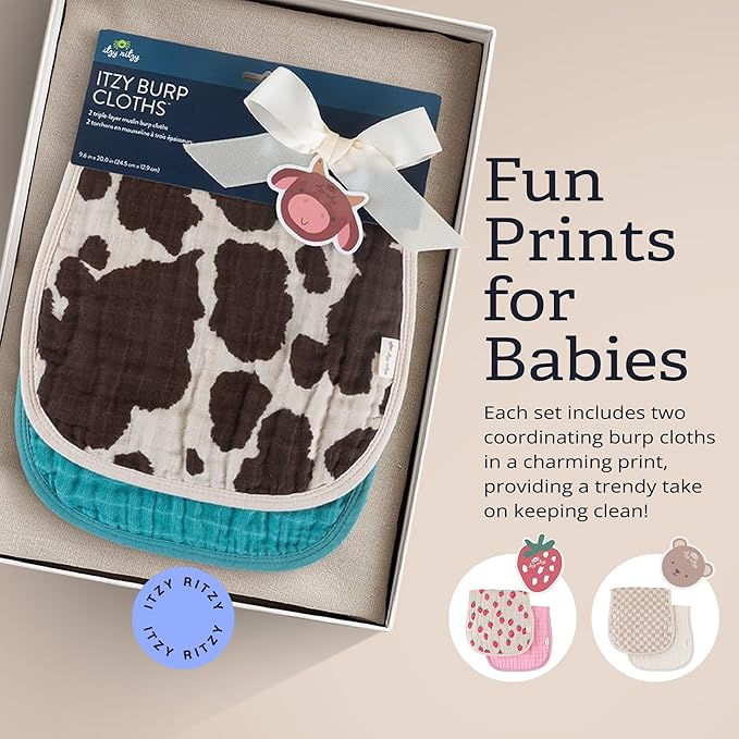 Itzy Ritzy Set of 2 Baby Burp Cloths – Ultra-Soft Absorbent Burping Cloths for Babies - Made of 100% Cotton Muslin and Generously Sized with Trendy Coordinating Prints – Machine Washable (Cow Print)