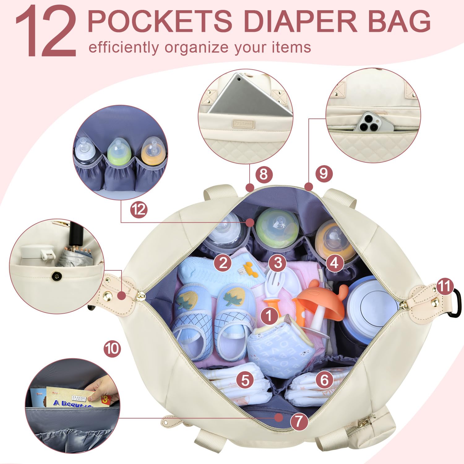 Diaper Tote, Baby Bags with Pacifier Case, Shoulder Straps, Stroller Clips, Waterproof Mommy Bag - Medium, White