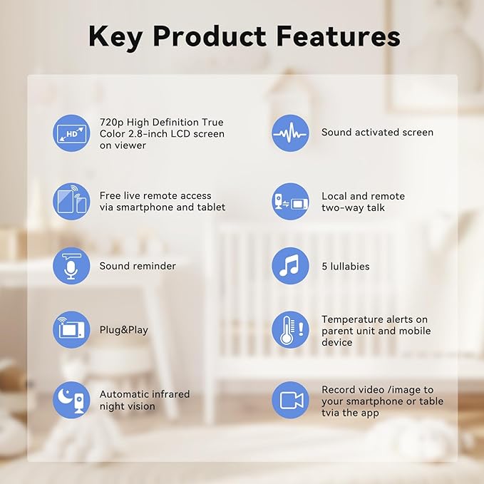 - 【Crystal Clear Audio and Video】: It's a baby monitor with camera and audio, which delivers real-time video and clear audio of your baby. with exceptional image quality, you can see every detail and hear every sound, ensuring you never miss a moment of your little one.