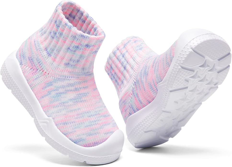 - Friendly Sock-like Upper: Sock-like stretchy textile construction upper hugs the foot to keep them comfortable and flexible when babies are on the move. Baby sock shoes made of soft fabric knit are also friendly to the skin, healthy, and very safe for infant babies.