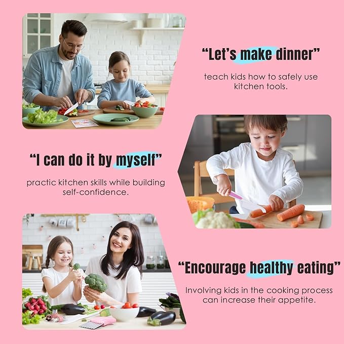 - 【GREAT GIFT FOR KIDS】Your kids will be eager to join you with this kids knife set in kitchen, children can cook in the kitchen with mother and encourage their creativity. You could even give them ingredients and let them create their own creations for the whole family to enjoy! Ideal gift for children's birthday Christmas, enjoy cooking time.
