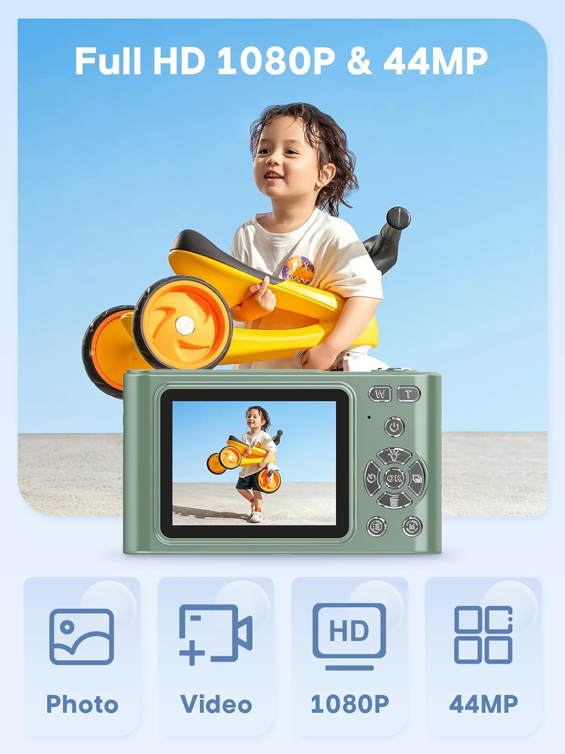 - 【1080P & 44MP Digital Camera】Capture stunning photos and videos with the Digital Camera. Equipped with a high-resolution CMOS sensor and an IPS color screen, this camera allows you to capture memories in vivid detail. With the capability to capture 44MP photos and record in smooth 1080p video, your photos and videos will come to life. Designed for kids, teens, and beginners, this point-and-shoot digital camera requires no intricate setup, making it easy to use and enjoy. It is the perfect tool for nurturing kids' interest in photography and creating delightful moments with family and friends.
