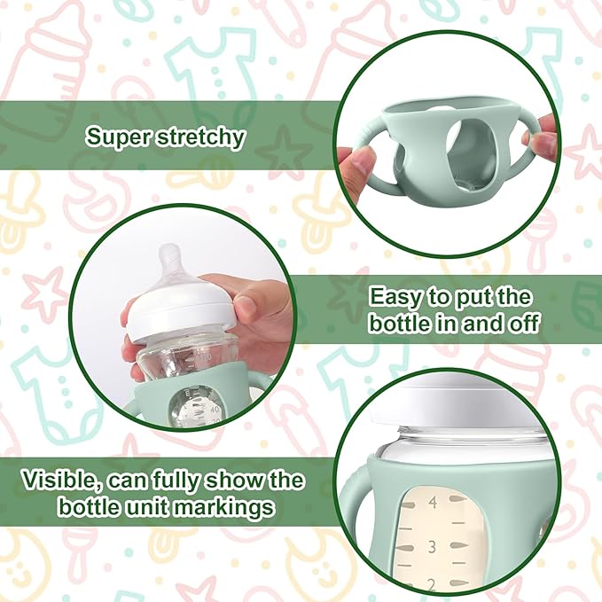 - Drop protection : Silicone bottle sleeves provides excellent protection for the bottle, bottom with reinforcement design, give that extra cushion in case the glass bottles fall, protect baby’s bottles from accidental drops breakage. It also anti-scalding if the glass is a little warm from heating up formula or milk