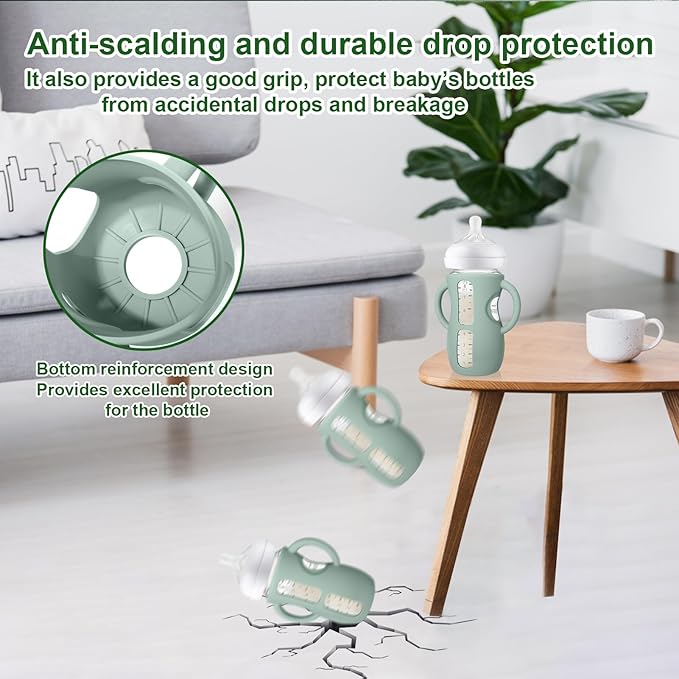 - Drop protection : Silicone bottle sleeves provides excellent protection for the bottle, bottom with reinforcement design, give that extra cushion in case the glass bottles fall, protect baby’s bottles from accidental drops breakage. It also anti-scalding if the glass is a little warm from heating up formula or milk