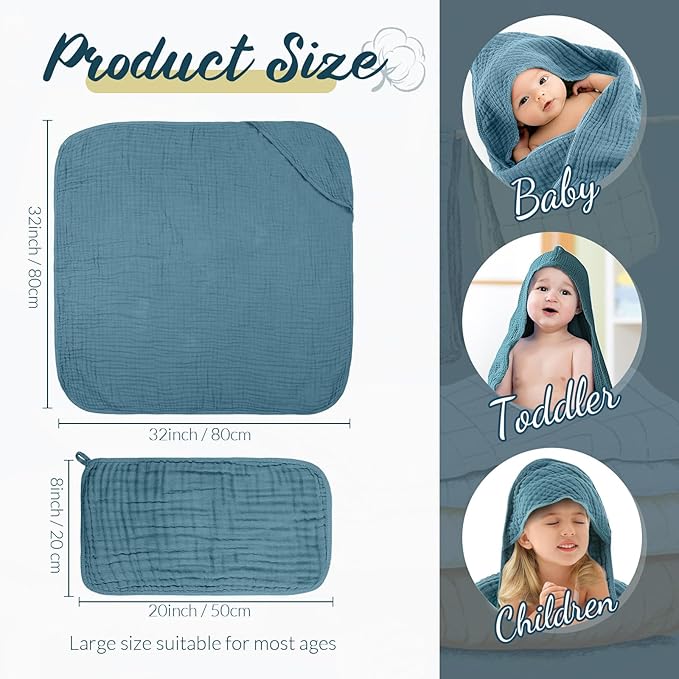 - Easy Care: this muslin cotton baby bath towels set is designed to be machine washable; The towels have quick dry capabilities, making them hygienic, easy to clean, and long lasting; Perfect for everyday use, these baby towels and washcloths set ensure softness and maximum absorbency remains uncompromised even after many washes