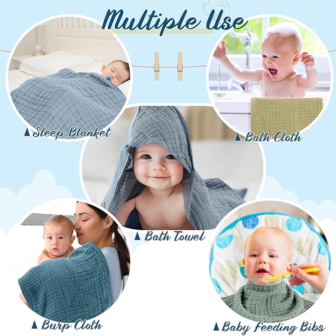 - Absorbent Infants Bath Towels: the baby bath towels and washcloths in this set boast 6 layers of muslin cotton; The quality muslin baby towels are adept at absorbing moisture from your baby's body quickly, ensuring they are dry and cozy after their bath; This ultra absorbency feature distinguishes these infant towels from the competition, making it the smart and efficient choice for baby care