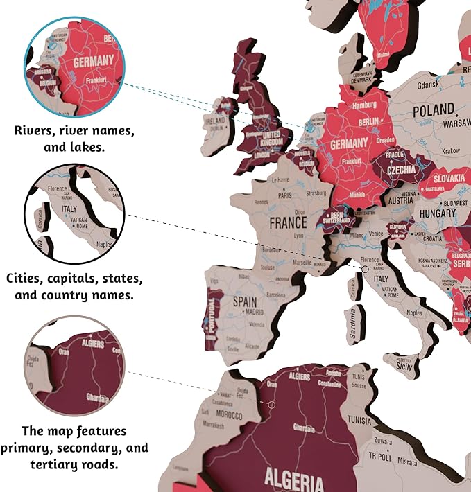 Colorfull Worlds 3D Wooden World Map Wall Art - Premium Multicolored World Travel Map for Wall Decor with Push Pins- Ideal Housewarming Gift & Travel Tracker (Medium, Crimson)