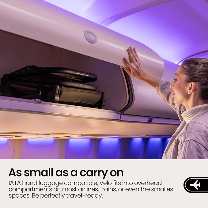 - One-Second Fold & Airplane Ready – Fold and unfold in just one second with one hand. Ultra-compact design (17 x 8 x 20 in) is IATA hand luggage compatible, fitting most airplane overhead bins and tight spaces. Weighing just under 17 lbs, the Velo is lightweight yet durable, making every trip stress-free.