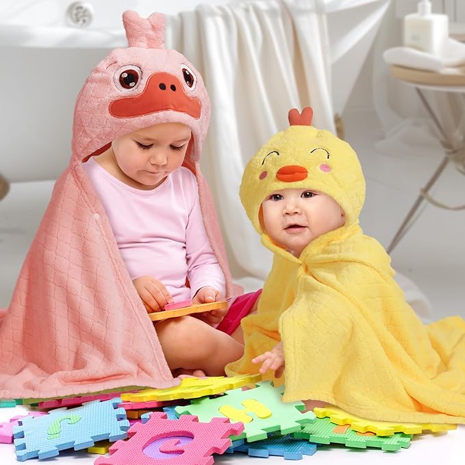 Baby Bath Towels with Hood,2 Pack Animal Hooded Toddler Bath Towel Baby Bath Towels Hooded Kids Towel for Boy Girl Baby Towels with Hood (32 x 50 Inch, L x W),Yellow Chick & Pink Duck