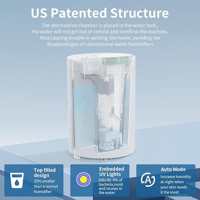 - 4-Liter Large Water Tank : 4L Aroma Overhead Top Refill Humidifier With UV that can run for up to 31 hours without needing frequent refills. The 270° rotating nozzle allows you to direct the mist in any direction,efficiently delivery mist to every corner of the room.