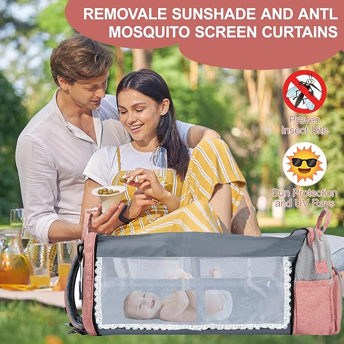 - Diaper Bag With Changing Table: can be used as a changing table or a resting cradle with a breathable and easy-to-clean baby mat, the cradle is equipped with a sunshade to protect the baby's eyes or to prevent mosquito bites, the all-in-one design makes travelling easier and more comfortable