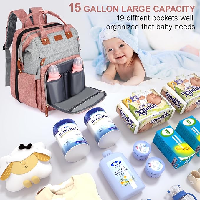 - Large Capacity Diaper Backpack: 15 gallons, 19 pockets to hold items, easy to organize baby essentials, front aluminum foil pocket for bottle warming, built-in waterproof bag for wet/dry separation, USB charging port, a backpack that can meet your storage needs in an organized manner