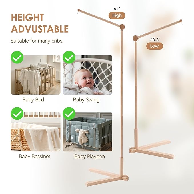 Floor-Standing Wooden Crib Mobile Arm 61 Inch | 360°Adjustable Movable Baby Mobile Hanger | Anti-Dumping Multifunction Mobile Arm for Crib | Adjustable Height Mobile Arm Nursery Decor
