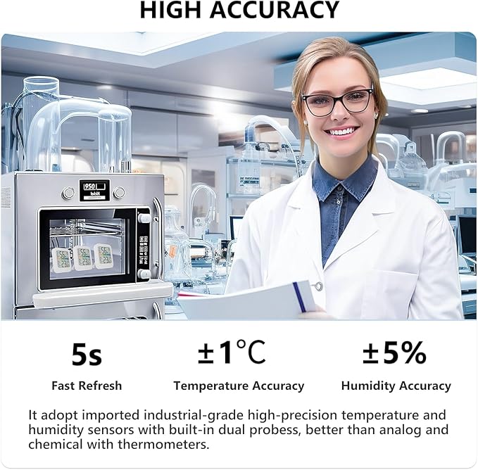 - Precision & Quick Refresh Rate - The built-in smart temperature and humidity sensor provides accurate readings every 5 seconds, ensuring temperature accuracy within ±1°F, +/- 2% RH (10%-90% RH), and +/- 4% RH (0%-9% RH, 91%-99% RH)