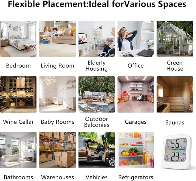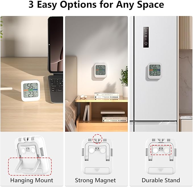- Flexible Mounting Options - This indoor thermometer offers three mounting choices: a hanging hole, a tabletop stand, and a magnet. Easily position it in various spaces.
