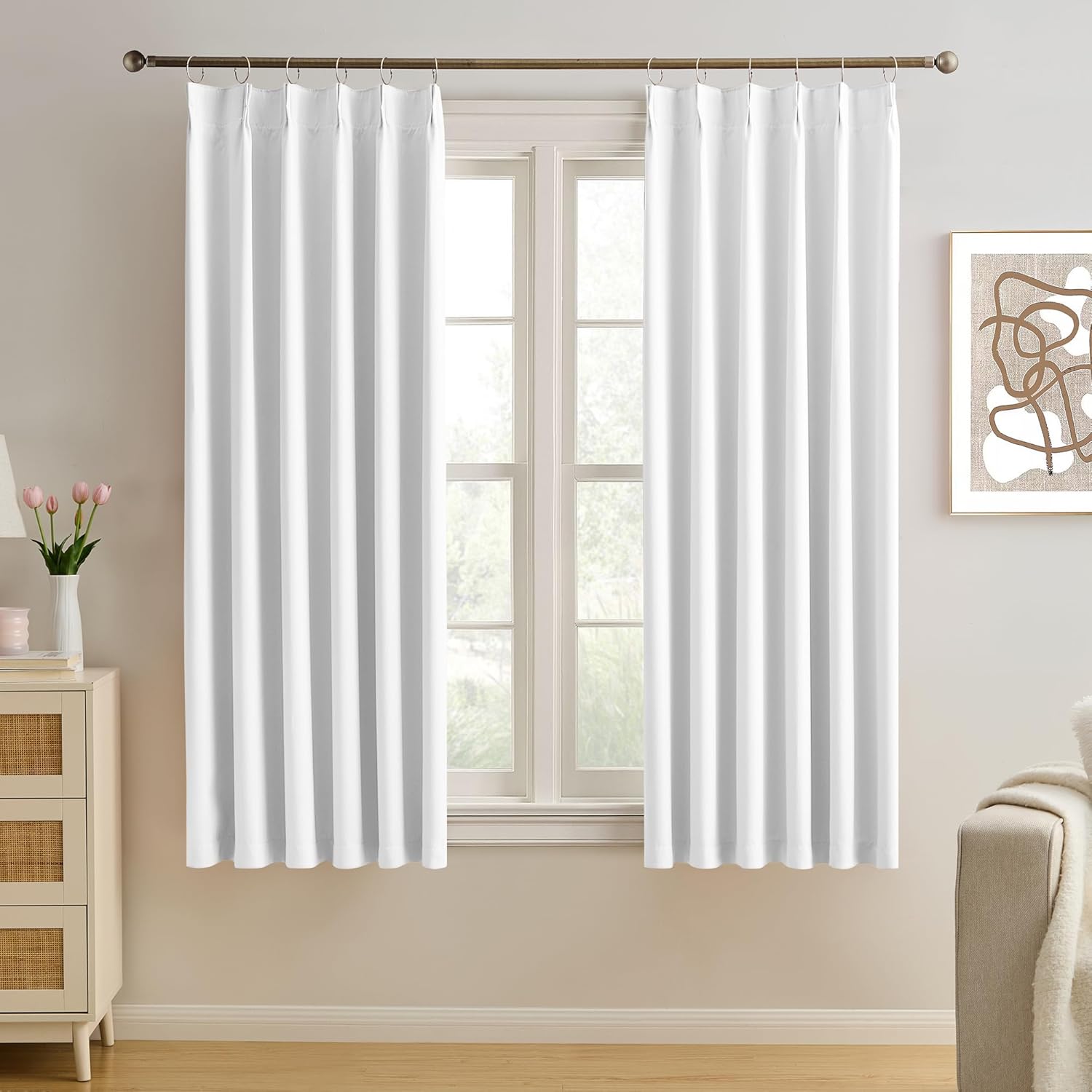 KEQIAOSUOCAI Pleated White Curtains 63 Inches Long,Half Blackout Room Darkening Short Window Curtain 63 Inch Length 2 Panel Set,Pinch Pleated Curtains with Hooks,40 by 63,Set of 2