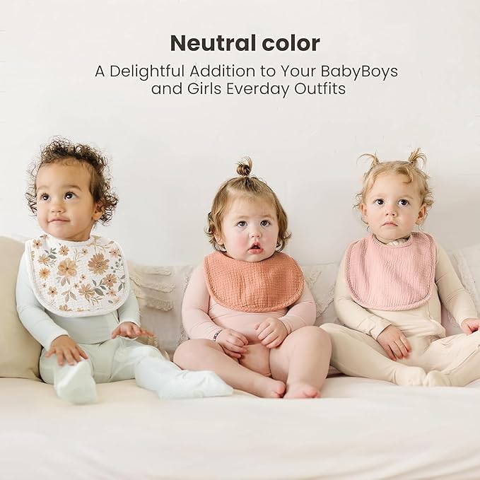 - Soft & Absorbent: These baby bibs are made with a 100% cotton muslin front and a polyester comfort fleece back for superior absorbency and a soft, skin-friendly feel. They effectively soak up drool and spit, keeping both you and your baby clean and dry-no more wet clothes