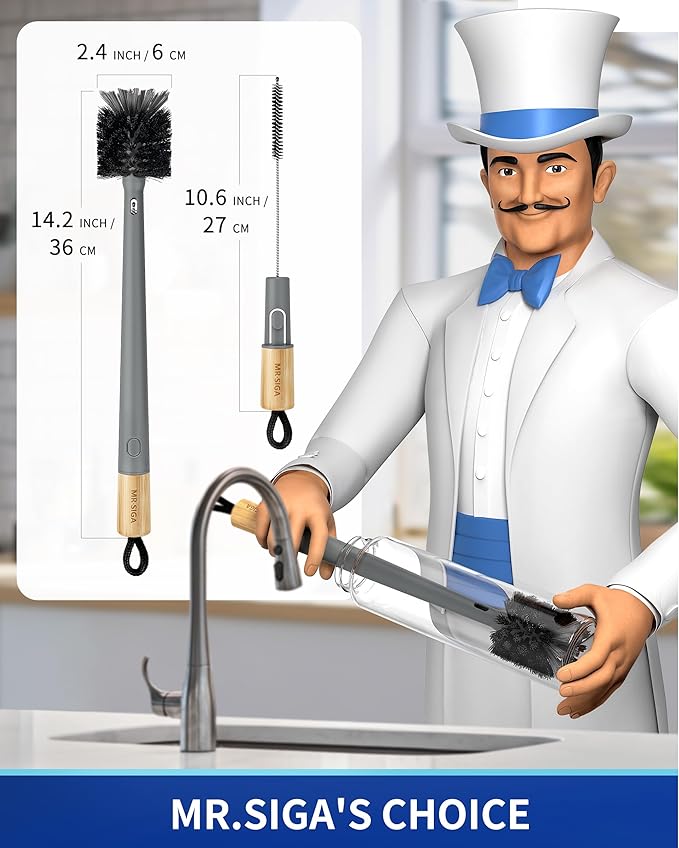 - 2-in-1 Versatile Cleaning Brush: The MR.SIGA water bottle brush and straw cleaner brush combines two essential cleaning tools into one sleek design. Effortlessly switch between cleaning wide bottles and narrow straws with a simple press and pull motion, revealing the hidden straw brush nestled within the handle.