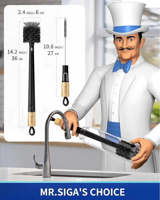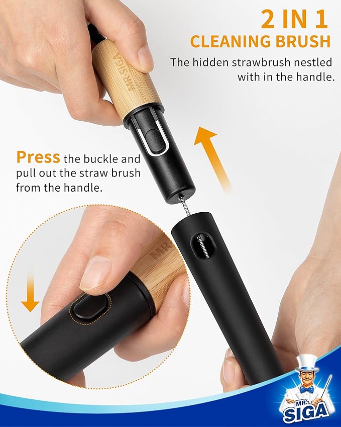 - 2-in-1 Versatile Cleaning Brush: The MR.SIGA water bottle brush and straw cleaner brush combines two essential cleaning tools into one sleek design. Effortlessly switch between cleaning wide bottles and narrow straws with a simple press and pull motion, revealing the hidden straw brush nestled within the handle.