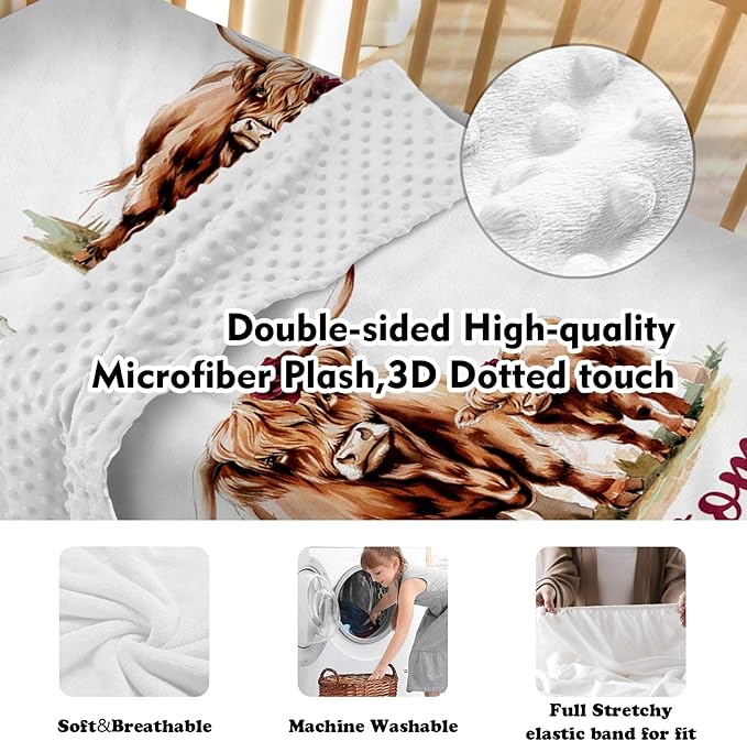 Personalized Nursery Crib Bedding Set: Custom Name 5 Piece Baby Crib Sets with Rose Highland Cow Pattern - Toddler Double Layer Blanket Set, Comfortable Crib Bed Sheets for Baby Grils