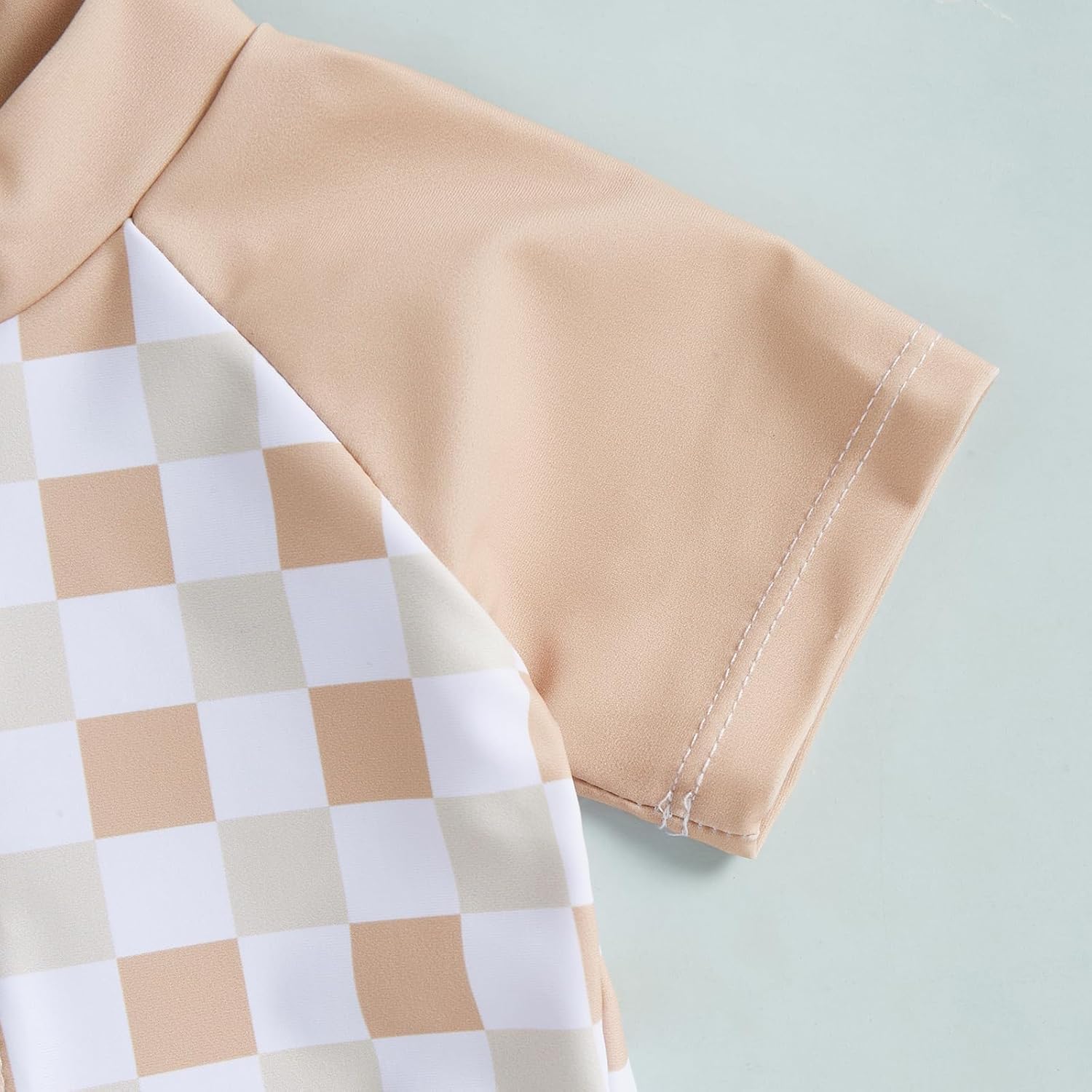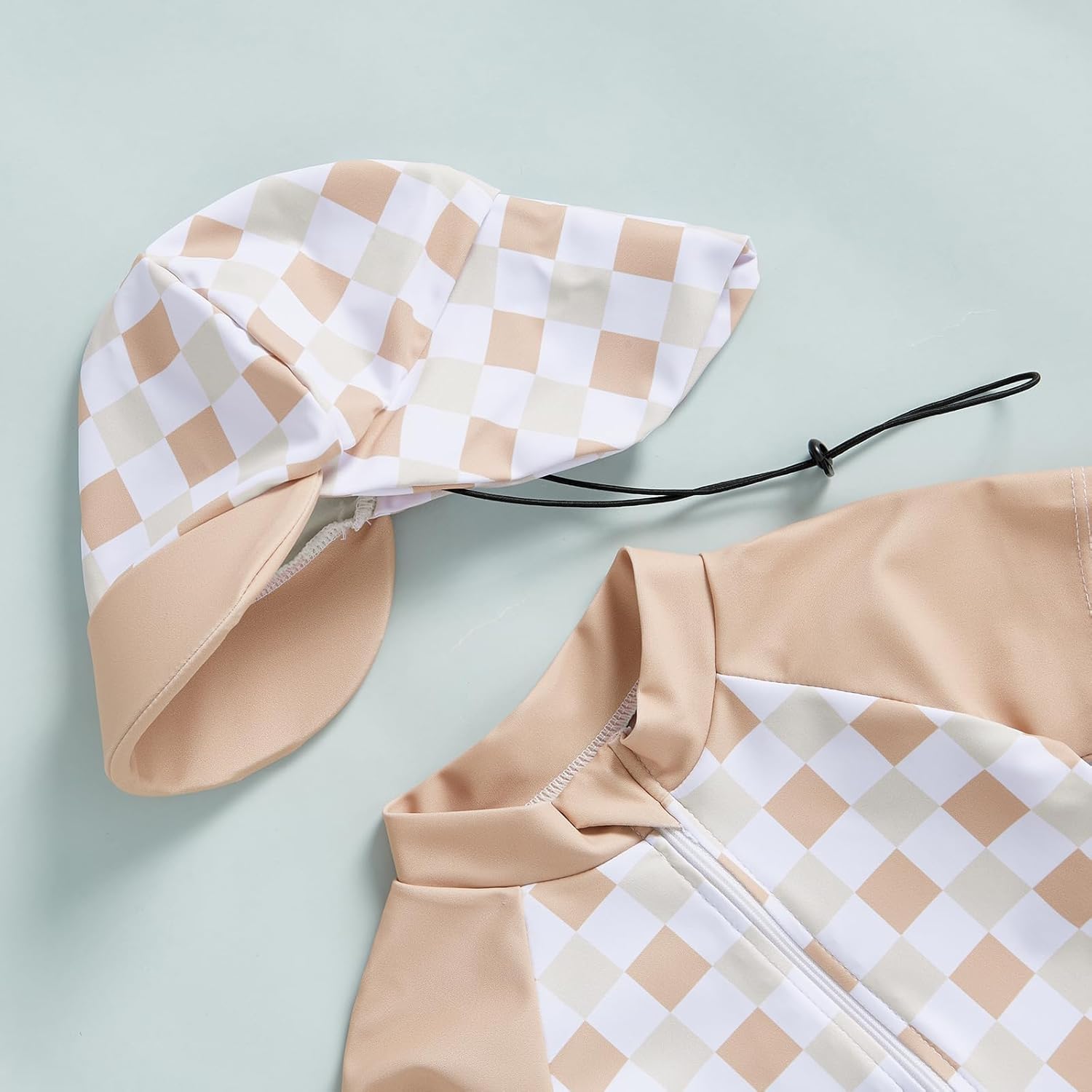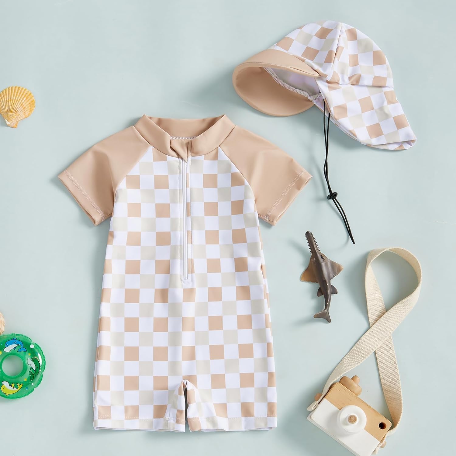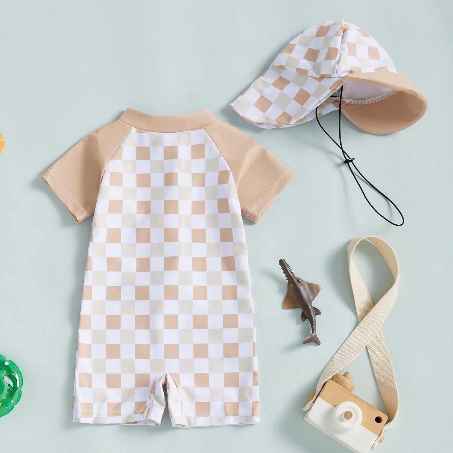 - KIDS BEACHWEAR: Baby boy rash guard swimsuit; Baby girls rash guard swimsuit,baby boy bathing suit classic plaid print, adding a fashionable touch; Short sleeves and round neck, front zipper closure, easy to put on and take off; And hat set, perfect for summer wearing