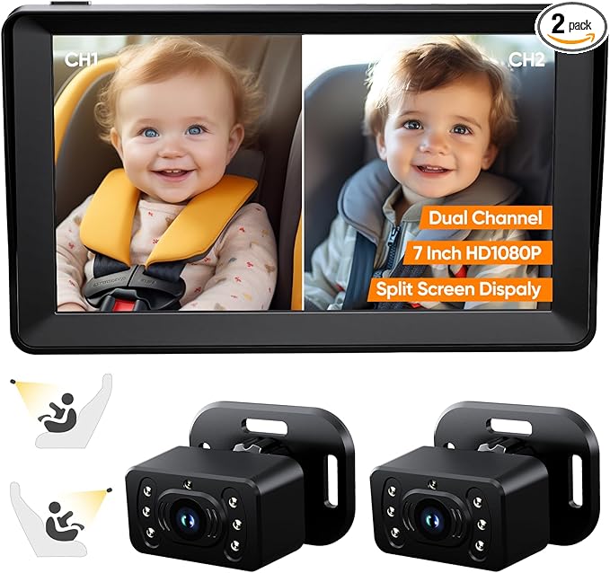 Baby Car Camera for 2 Kids - 7 Inch HD1080P Split Screen Baby Monitor with Dual Backseat Camera 150° Wide View & 360° Rotatable, Night Vision Easy Install, Rear-Facing Baby Car Mirror