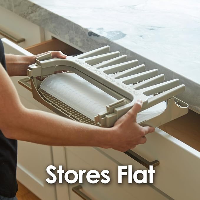 - ✅ BEAUTIFUL SPACE SAVING DESIGN: Great for air drying everyday items like plastic bags, cups, baby bottles, tumblers and most items which are not dishwasher safe. The compact drying rack sits near the back of your counter, leaving the front counter area available for use. The silicone drying mat keeps moisture off of your counter–the clear frosted mat works with ALL countertop colors and folds in half for easy storage.