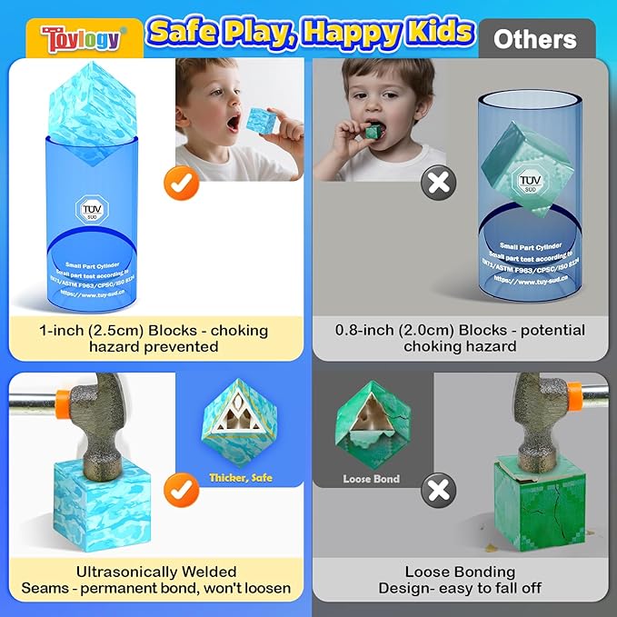 - 【SAFE & COMPATIBLE MAGNETIC DESIGN】Toylogy magnetic blocks with a 1-inch larger, safer design with 8 magnets for smooth connections and ultrasonic welding for extra durability, making toddlers difficult to pry open. The strong magnetism is very suitable for kids 3+ years old to build solid structures. Toddlers will not be upset about magnetic building blocks that cannot construct. The rounded edges and suitable size will not hurt small hands and prevent swallowing hazards.