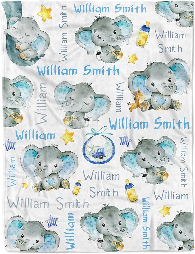 Personalized Elephant Baby Blanket for Boy Girl Custom Name Blanket for Baby Shower Customized Birthday Christmas Newborn Gifts