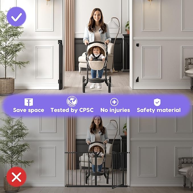 - Reliable and Sturdy:Certified by CPSC, this mesh baby gate is crafted from soft, durable mesh fabric, minimizing injury risks for babies while playing. Its strong design resists pet bites and scratches, making it perfect for both indoor and outdoor use as a retractable gate indoor
