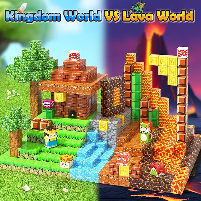 - 100PCS MAGNETIC BLOCKS ADVENTURE SET: The magnetic blocks set is perfect for kids who love the game. These magnetic building blocks are easy to assemble and not easy to collapse like other normal building toys, attracting curiosity, and boosting confidence. The magnet toy includes various game elements like grass, blocks, coin blocks, ? blocks, lava, water...suitable for designing levels, developing creativity and ideal for STEM learning and enhancing fine motor skills