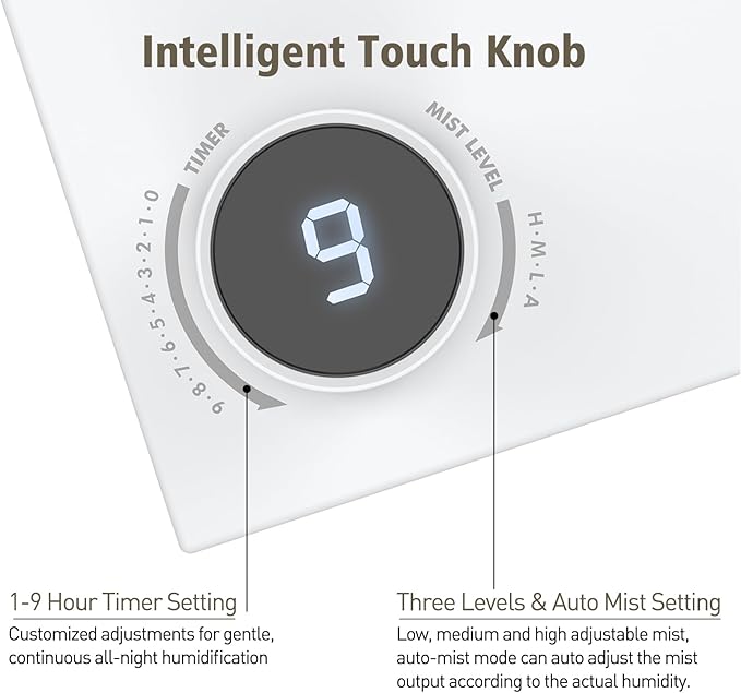 - đ§MULTIFUNCTIONAL & SMART - This humidifier has 3 adjustable mist levels: low, medium, and high, with a maximum mist output of 300 ml/hour. The Auto Mist Mode allows the mist output to be adjusted automatically based on the humidity in your room. The 1-9 hour timer allows you to freely set the operating time.