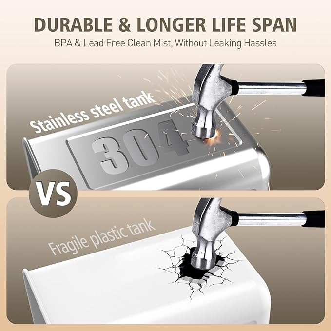 - đ§304 STAINLESS STEEL WATER TANK - Food-grade material stainless steel water tank, free of chemicals, BPA and lead. You can clean it daily with water or deep clean it by boiling it. The tank has 7.3 inches diameter, allowing you reach out to clean the inside, easy to clean and leaves no dead ends. The cool mist humidifier can hold 2.5L / 0.7 Gal water, once filling water can be used for up to 24 hours.
