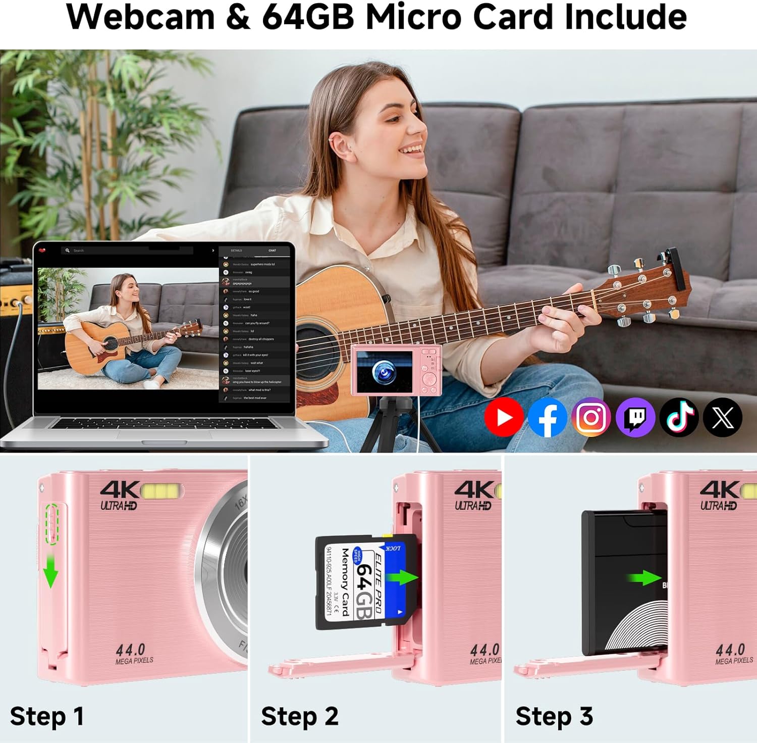 Digital Camera, FHD 4K 44MP Digital Camera, 16X Digital Zoom, Digital Point and Shoot Camera with 3-LED Fill Lights, 64GB SD Card, Compact Camera for Kids Teen Boys Girls, Pink