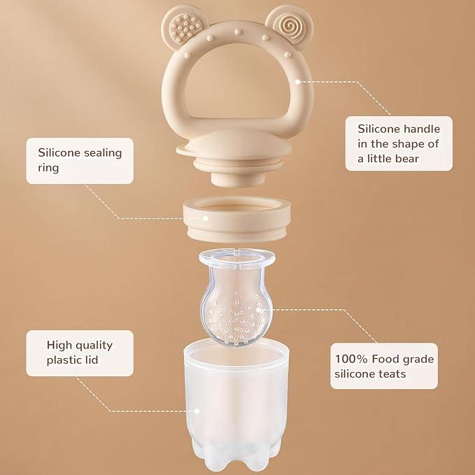 - HIGH-QUALITY BABY FRUIT/FOOD FEEDERS & TEETHERS: These innovative devices allow your little one to safely try new foods.The soft silicone pouch is designed with tiny holes encouraging for self-feeding, that only ensuring small, digestible pieces are consumed. Our one-piece silicone handle design eliminates choking hazards, offering a safe, worry-free feeding experience.