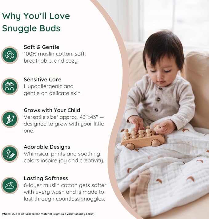 - Generous Size & Versatility: Measuring 43x43 inches, this blanket is thoughtfully designed for a variety of uses. Whether as a breathable blanket for stroller rides, a toddler quilt for bedtime, or a cozy layer for tummy time, its generous size ensures it grows with your little one. Perfect for babies, toddlers, and young children, this multi-functional cotton muslin blanket is a must-have for parents seeking comfort, durability, and versatility.